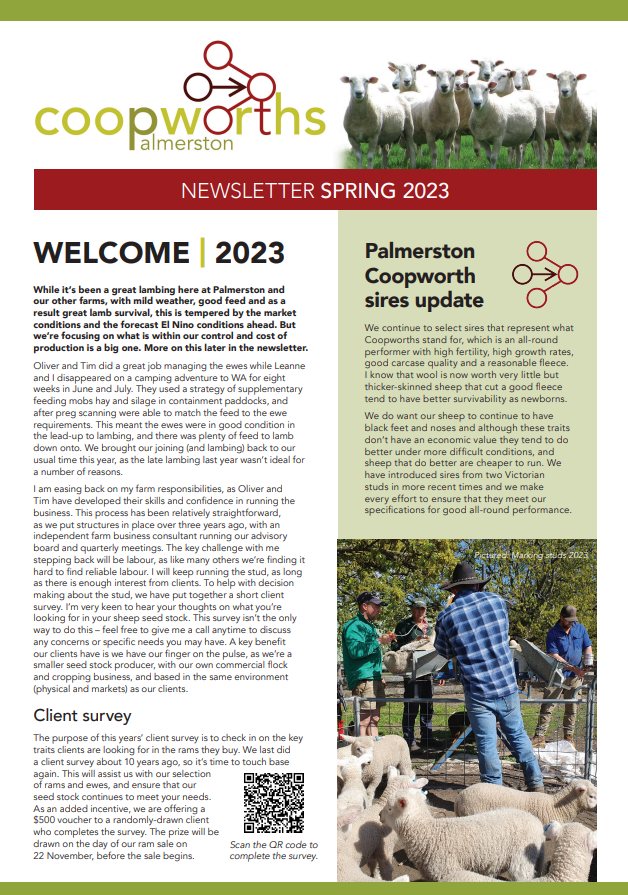 Our latest newsletter provides an update on outlines the latest news from Palmerston Coopworths, including articles on cost of production, the MLA satellite flock eating quality trial and more on worm management. To read the newsletter in full click here. We hope you find it an interesting read and if you have any questions feel free to give Bill a call.